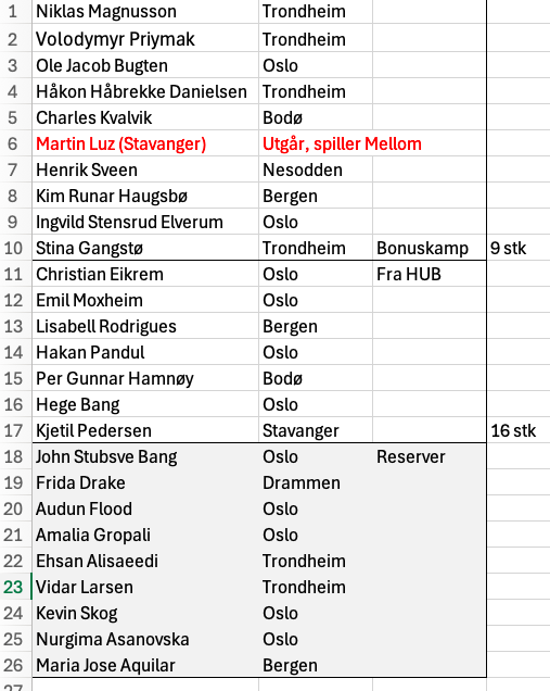 Norgescup Begynnerklassen 2025 - Nå med oversikt over de kvalifiserte som skal til Begynnermøtet 17. januar 2026 Der skal bli 16 stk, men siden der var bare 8 som hadde fått poeng i tabellen, måtte vi hente resten fra HUB sin clubtabell. I tillegg måtte der trilles terning for å finne korrekt plassering på Frida, Kjetil, John og Hege - som lå helt likt på 15'de plass inne på HUB.