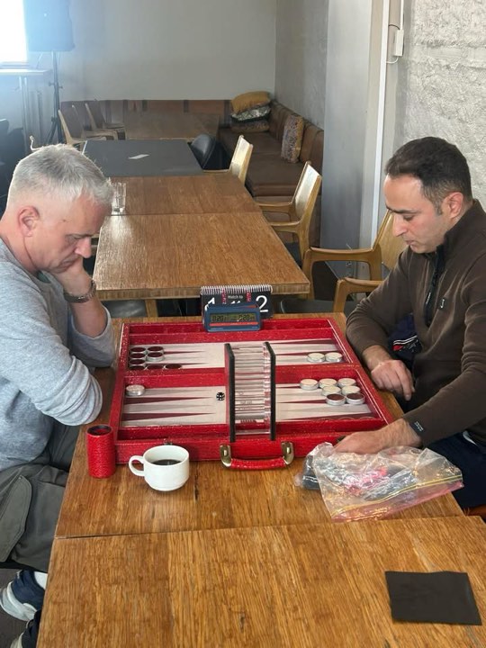 Finale i begynner, Ole Jacob mot Alexander. I bakgrunnen ses bronsefinalen mellom Henrik og Stella. På bildet til høyre spiller Helge (t.v.) mellomfinale mot Mohammad