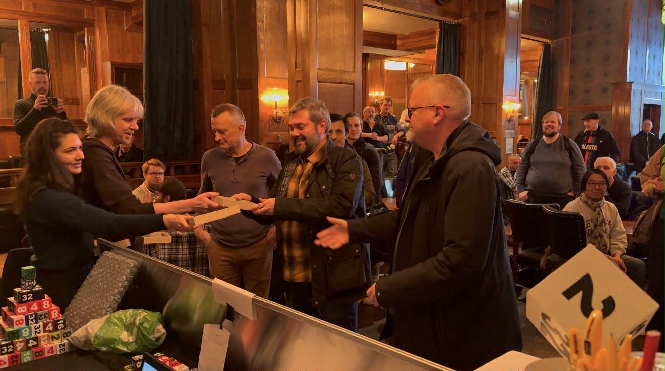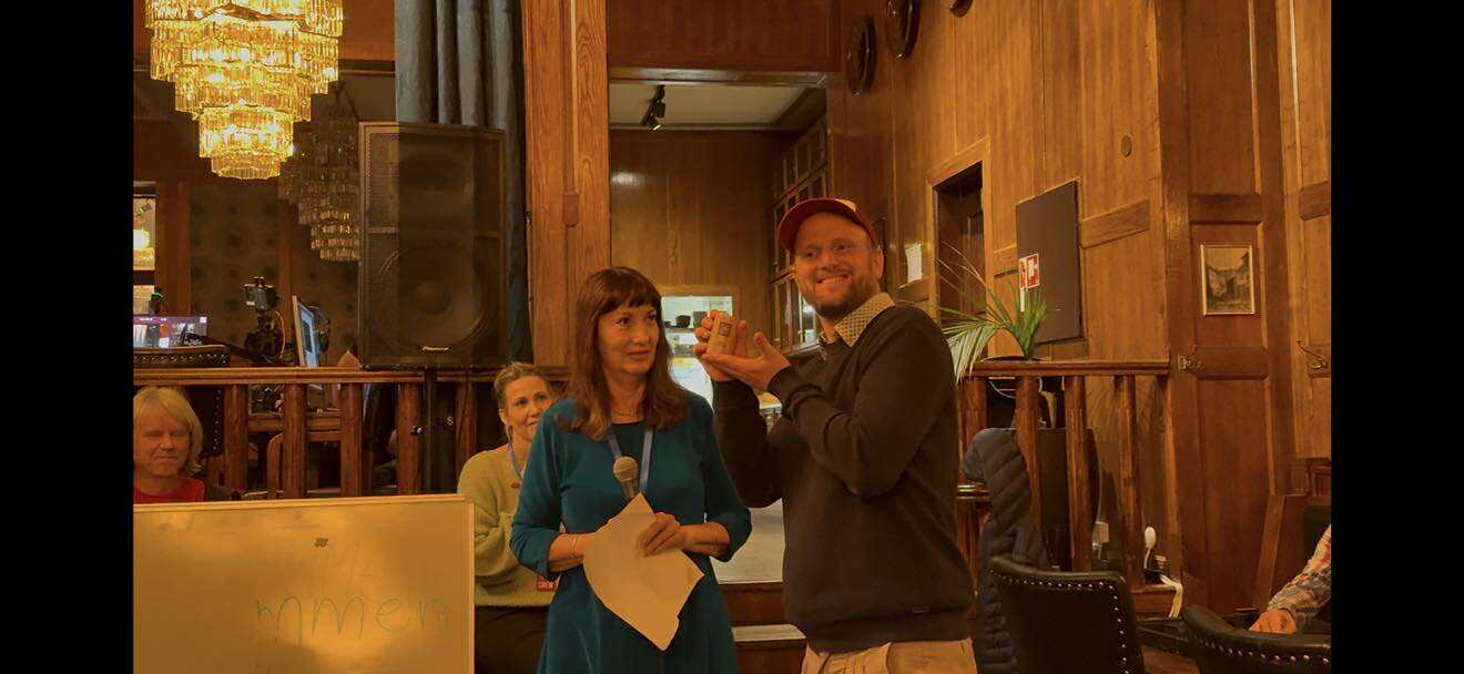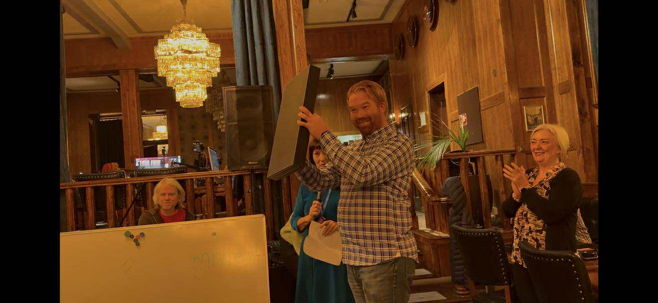 Helge med premien som vinner av mellomklassen, et lekkert reisebrett fra Alan Masters