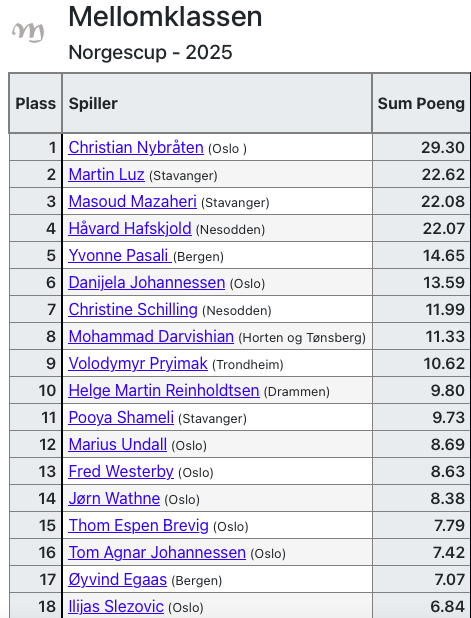 De 16 beste fra 3 poengtabeller er klare. Les mer i nyheten om format og gjennomføringen av 3 klasser Finalespill Norgescup 2025 blir! Vi gratulerer alle 16 x 3 deltagere i sluttspillet og velkommen til nye sjangser i 2026!