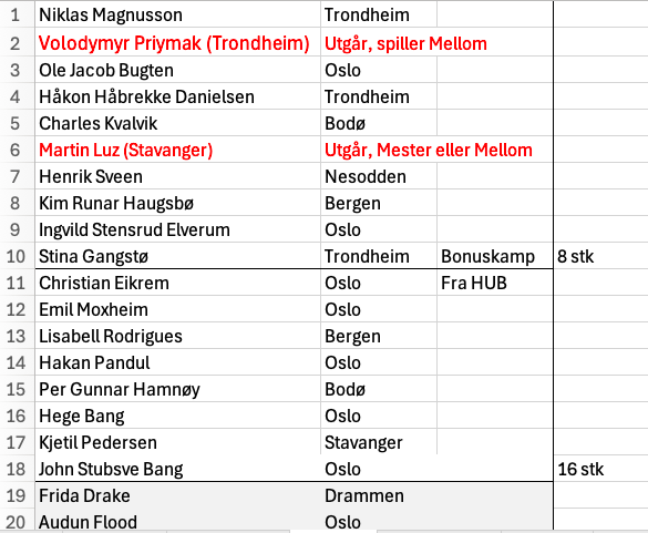Alle 16 får invitasjon (innen 3.1.26) og må akseptere (innen 10.1.26) til turneringsleder Marianne S. Husum Ved frafall rykker nestemann opp fra listen.