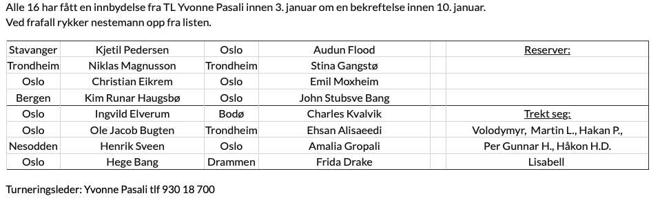 §6.3: Turneringsleder har ansvaret for å invitere de 8 innen 3. januar og be om bekreftelse innen 10. januar. Hvis noen melder forfall eller ikke gir beskjed går plassen automatisk til nestemann på listen. I tillegg kommer de resterende 8 fra HUB og bonusmatchtabellen.