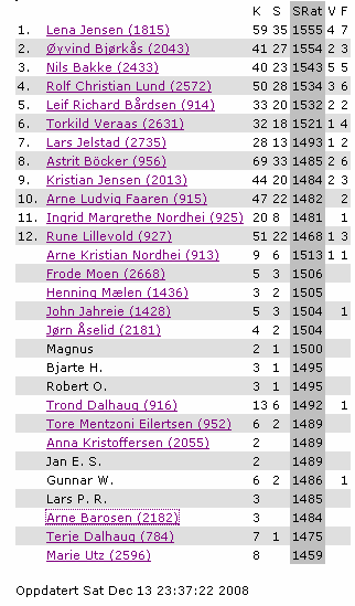 Oppdatering 13. desember, klubbkveld 24 og sesongavslutning: Lena Jensen er sesongmester etter en dramatisk avslutning. Hun vant sine tre kamper i oppsamlinga, noe som var n�dvendig for � g� forbi �yvind n�r han tapte sine kamper b�de i hoved- og oppsamlingsturneringa. Differansen ble til slutt bare ett poeng. Lena tok dermed sin f�rste sesongmestertittel. Nils vant mesterturneringa etter � ha sl�tt Arne i f�rste runde, Lars i kvartfinale, J�rn i semifinale og Rolf i finale. Neida, det ER spillere i Bod� med navn p� flere enn fire bokstaver, de vinner bare ikke s� mange kamper. N� er h�stsesongen over, og v�rsesongen begynner sannsynligvis 5. januar. Velkommen da og god jul!