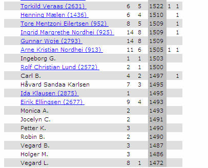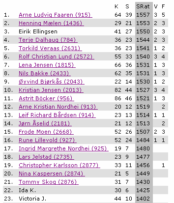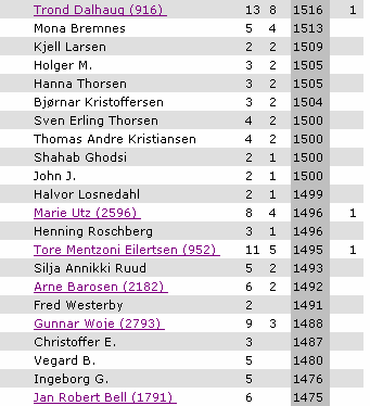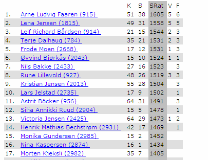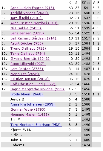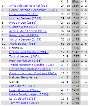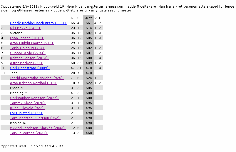 Oppdatering 15/6, klubbkveld 23. 8 spillere. P� sesongens siste klubbkveld tok Victoria sin f�rste turneringsseier. Gratulerer! Arne Ludvig tok et suverent sesongmesterskap, og sitt tredje p� rad. Han har vunnet 75% av kampene i v�r og har v�rt den 4. mest aktive. Gratulerer! Lena ble nummer 2 og Leif tok 3. plass etter � ha klatret p� slutten. Ellers har vi f�tt flere nye, lovende og aktive spillere, der spesielt Victoria har utmerket seg med sv�rt h�y aktivitet og en finaleseier, og Henrik har en finaleplass. Deltakelsen p� tirsdagskveldene har g�tt noe ned n� p� v�ren, s� styret vil vurdere hvilke tiltak som er best. Likevel m� vi v�re forn�yde med at 17 spillere har h�y nok aktivitet til � f� plassering i sesomgmesterskapet.