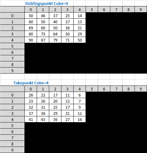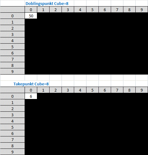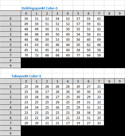 Nedenfor ser man doblings og take punkter i 9 poengs matcher når cuben =1, 2, 4, eller 8 på alle scorer. Doblings og takepunkter når cuben = 1
