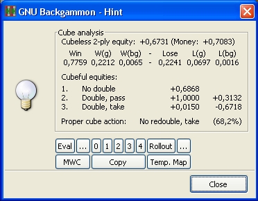Stillingen ble raskt matet inn i Snowie etter matchen som sa noe sånt som at jeg vinner 79% hvorav 20% gammon. Jeg klarer ikke sette opp stillinger i GNU, så jeg har ikke fått gjort en skikkelig rollout av den.