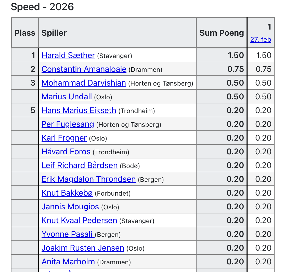 Vi spiller dobbel eliminasjon (2 liv) 7 P - du har 2 min og 48 sec på hele kampen + 6 sekund pr trekk.