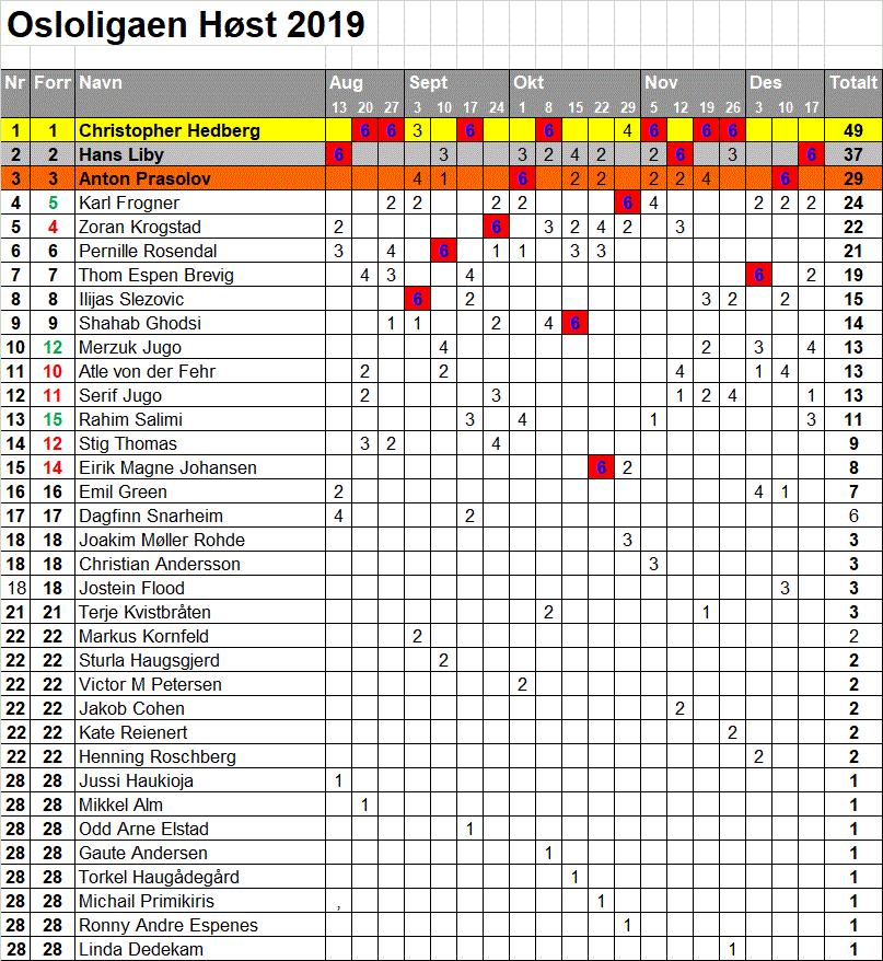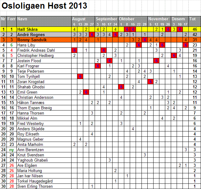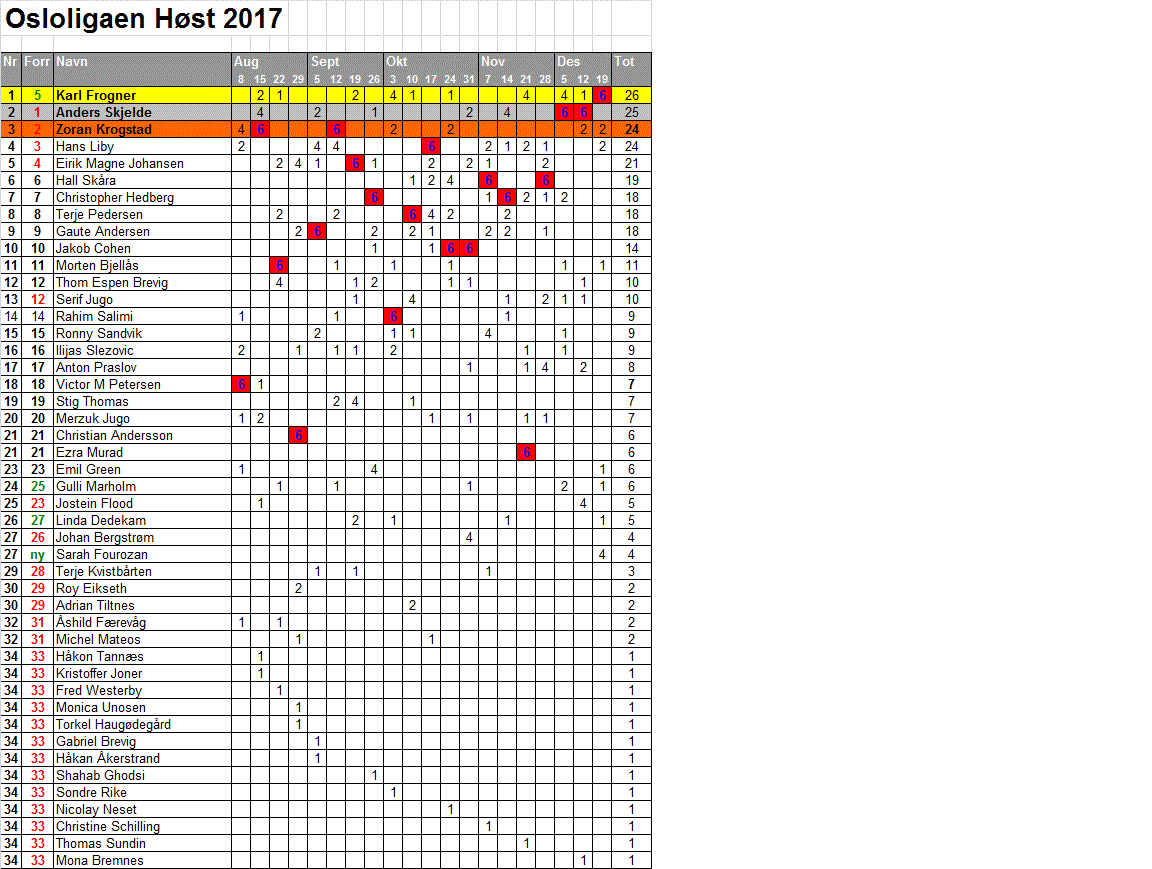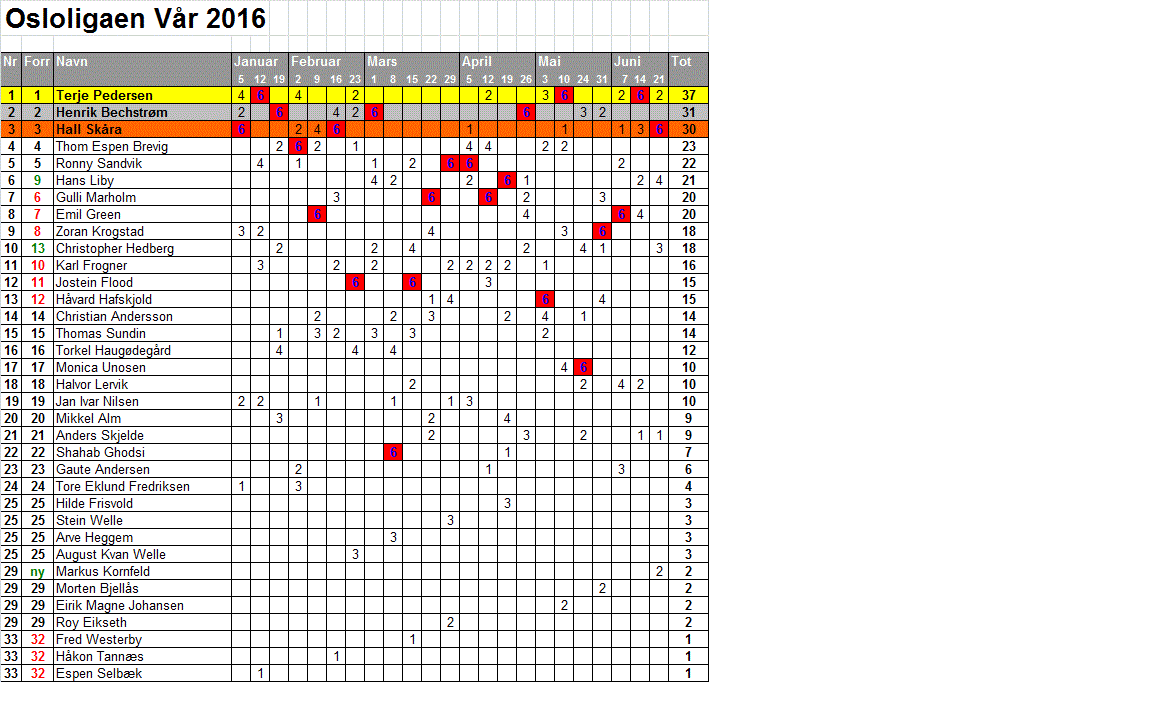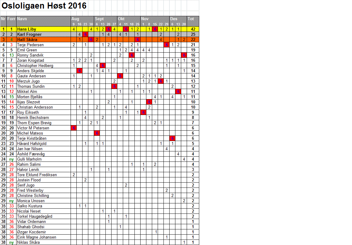 Fra 9. august 2016 gjennomgikk Osloligaen en endring i sitt poengsystem. Selv om poengtildelingen i hovedturneringen forble den samme—seks poeng til vinneren, fire til finalistene og to til semifinalistene—ble det gjort en endring i oppsamlingen hvor poeng for vinner og finalist ble fjernet. Istedenfor begynte man å tildele ett poeng til kvartfinalistene i hovedturneringen.