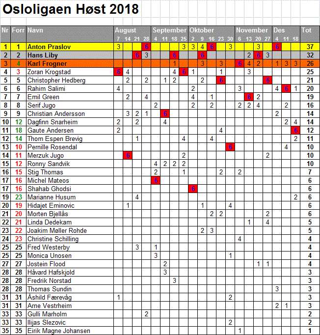 Fra 16. januar 2018 returnerte Osloligaen til sitt opprinnelige format. Vinneren i hovedturneringen mottar seks poeng, finalisten fire poeng, semifinalistene to poeng, vinneren av oppsamling tre poeng og finalist i oppsamling ett poeng.