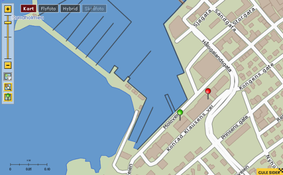 Grønn pil er Nordlys hotell hvor vi bor og spiller backgammon, rød pil er hang out-sted.