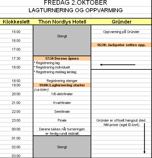 Nå er det bare en dag igjen til årets Norgesmesterskap i backgammon. Fredag 2.oktober er det oppvarming, lagturnering og sosialisering som står på plakaten. Vi ønsker alle velkomne til Bodø. I bildet under ser du tidsplanen for det som skal skje fredag, og lengre ned for lørdag og søndag. Mange kommer til Bodø lenge før turneringslokalene åpner, og ønsker dere å gjøre noe annet enn å sitte på hotellrommet anbefaler vi folk å møte hverandre på Gründer. Her vil vi fra ca halv fem starte noen jackpoter, og vi kan også anbefale folk å spise middag her. Vi har avtale med Gründer og får backgammonpriser hele helga , det bare å si i fra om at man er med i NM i backgammon for å få våre svært fordelaktige priser (ved registrering senere får du rabattkort).