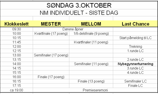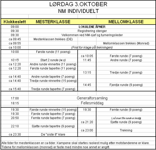 Merk deg at tidene lørdag stort sett er faste for mellomklassen slik at spillerne selv kan styre sine pauser. Blir du fort ferdig en kamp lørdag vet du når neste kamp skal starte. For mesterklassen er det en del som får w.o i første runde. Disse kan begynne å spille sin kamp (2.runde) ca et kvarter etter første runde er satt i gang. Tidene i skjemaet gjelder stort sett de som ikke har w.o. Dette gjør at mesterklassespillerne i større grad har et ansvar for å være til stedet når neste kamp skal starte. Etter generalforsamlingen og middag skal dette være justert. Husk at dersom du kommer for sent til din kamp vil du kunne straffes (paragraf 2-2 i turneringsreglene).