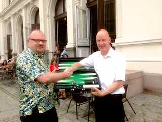 Charles Hill (til høyre) overrekker ligabrettet til den nye ligamesteren Terje Pedersen