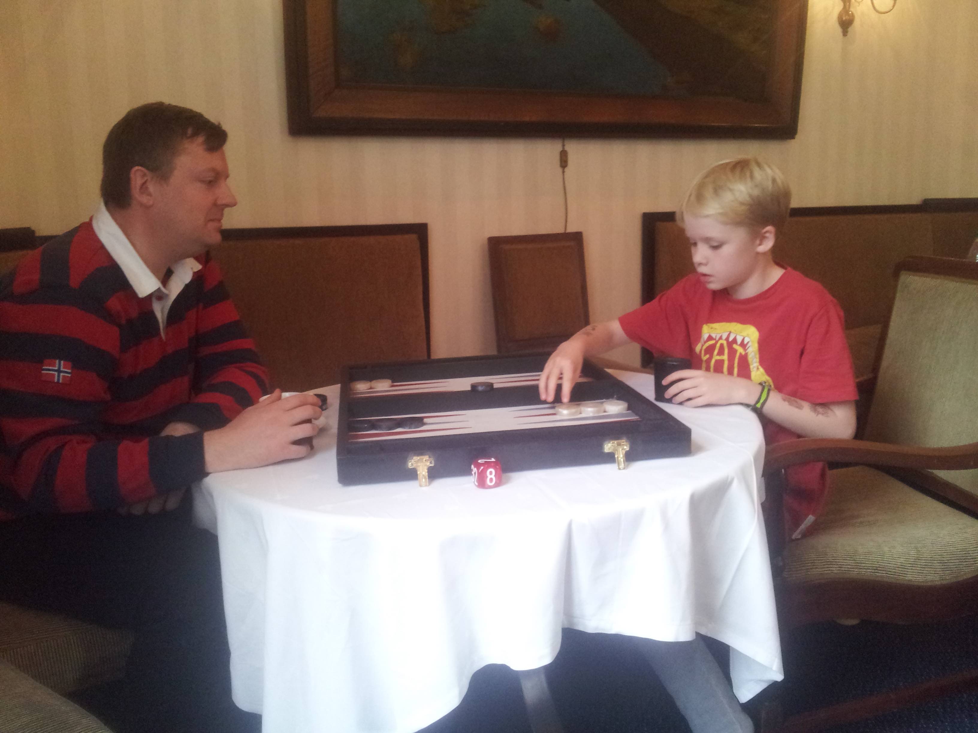 2. Du kan få spille mot Norges yngste backgammon turneringsspiller. Når selv August (11), sønn til Stein Welle, kommer til Bergen så skal det gode grunner til for å bli hjemme. August har tross sin unge alder flere skalper i beltet. Bare spør Jon Kr. Røyset som måtte gi tapt mot August under NM i fjor.