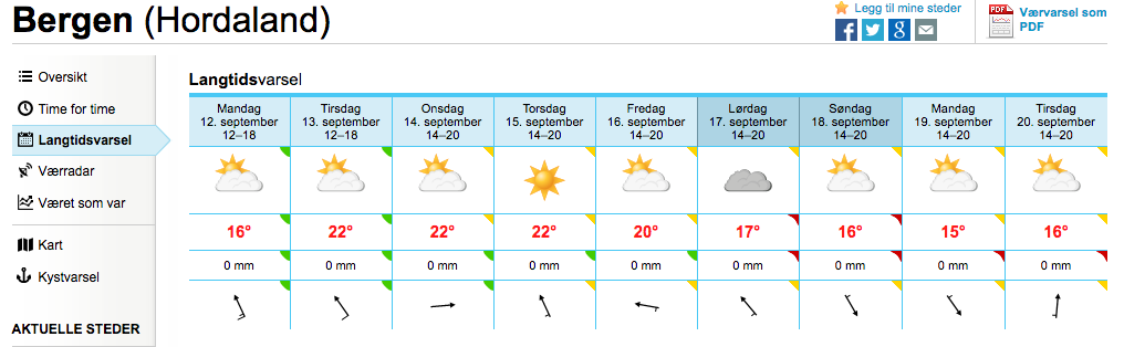 4. Været! Det skal liksom regne så mye i Bergen. Vel, Yr kan ikke spå to uker frem i tid, men det er ikke langt unna. Sjekk skjermbildet av langtidsvarselet for Bergen. I rest my case. Bergen i godt vær er noe av det fineste som finnes, og at du har fått oppleve det er noe du kan fortelle om til barnebarna når du blir gammel.