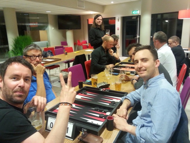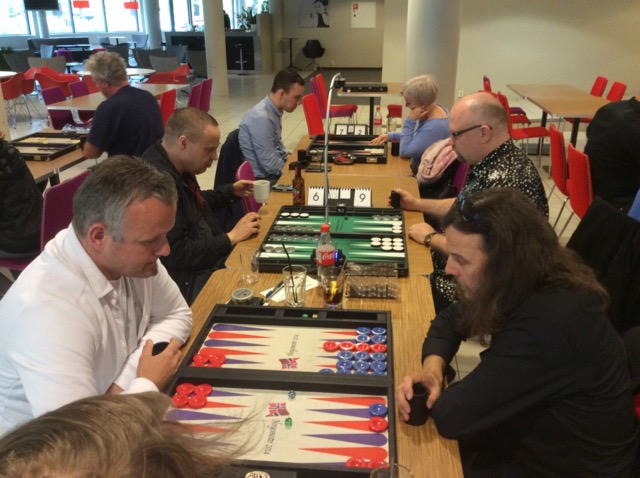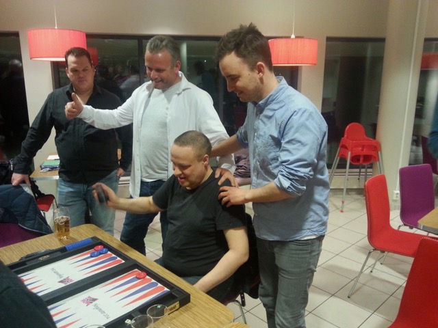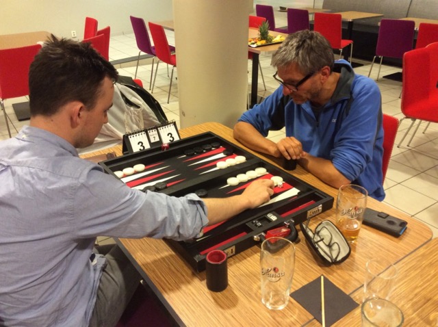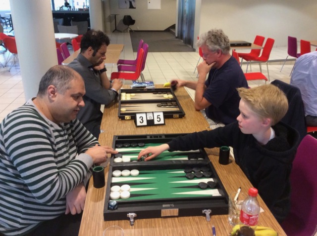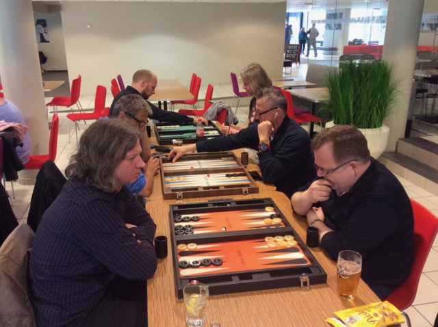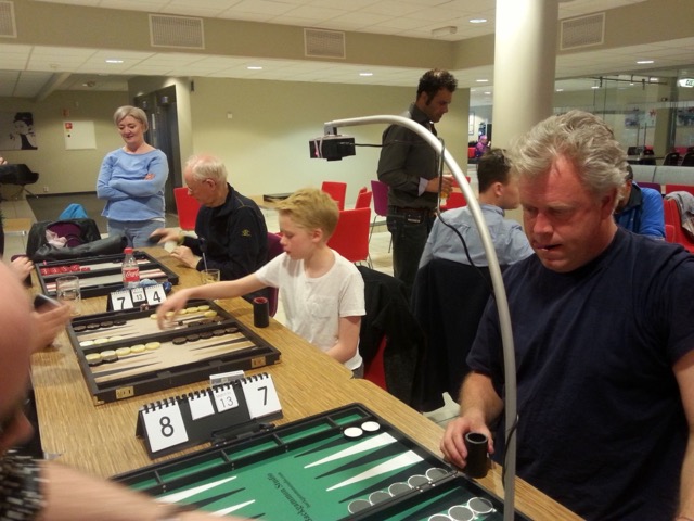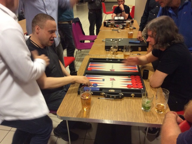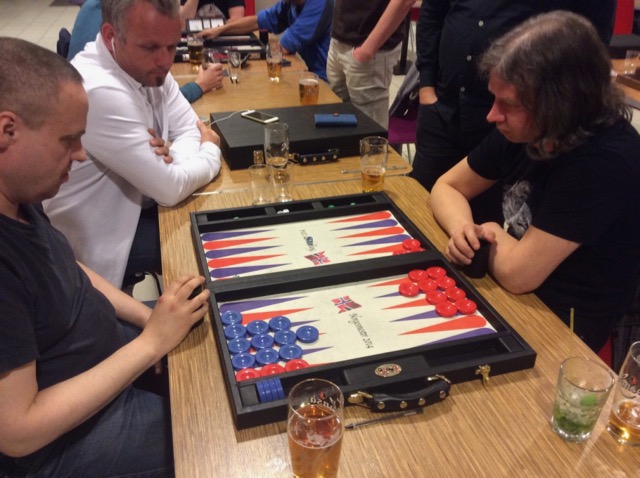I kampen mellom Terje Pedersen og Karl Frogner må det ha skjedd et eller annet jeg ikke oppfattet. Karl ble oppbrakt over at Terje fikk ham på bar og fikk store sjanser til doblet gammon. Slikt skjer jo hele tida, men en kommentar fra en ikkespillende Underdogs hørtes ut til å ha noe med saken å gjøre i følge Karl. Terje fikk sin gammon og gikk opp til 11-7, tror jeg. Oppmuntring fra lagkameratene roet Karl ned. Karl plukket så noen poeng og stillingen ble 9-11. Og så gikk det ikke likere enn at Karl ga en sjansekube (som trolig måtte tas), vant gammon og kampen. Terje satt betuttet tilbake og så ut som han hadde solgt smør, men ingen penger fått. Fullt forståelig etter en slik sjokkartet snuoperasjon fra en motstanderen som kort tid før var nede for telling til 8.