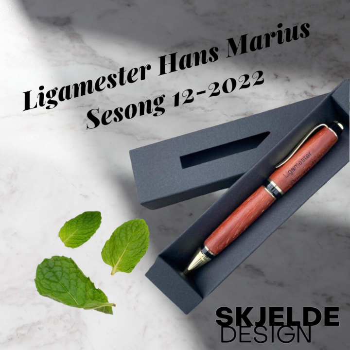 Og premien hans er en lekker gravert penn levert av vår egen Anders Skjelde: