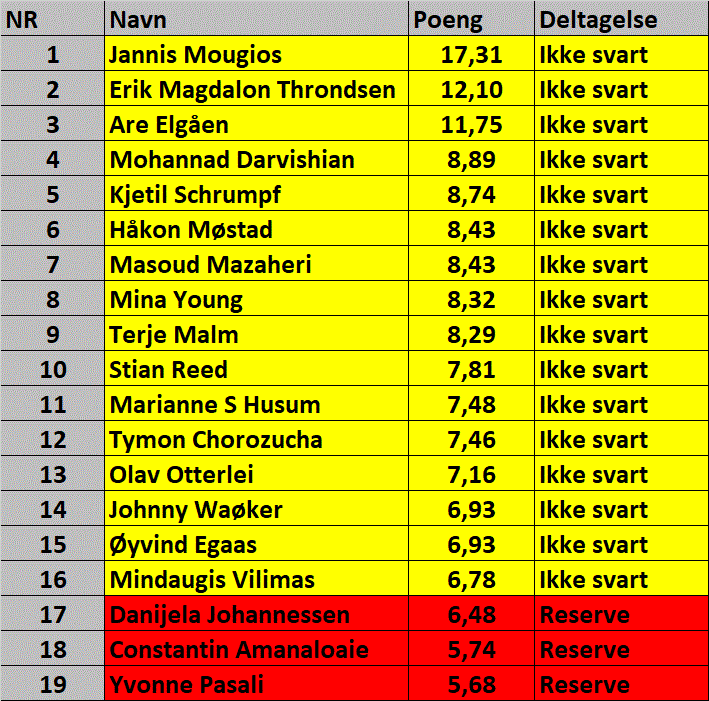 De 16/16/8 beste fra 3 poengtabeller er klare. Les mer i nyheten om format og gjennomføringen av Begynnermøtet (online) 13. januar, Mellommøtet (online) 20. januar og Mestermøtet LIVE i Oslo 27.-28. januar