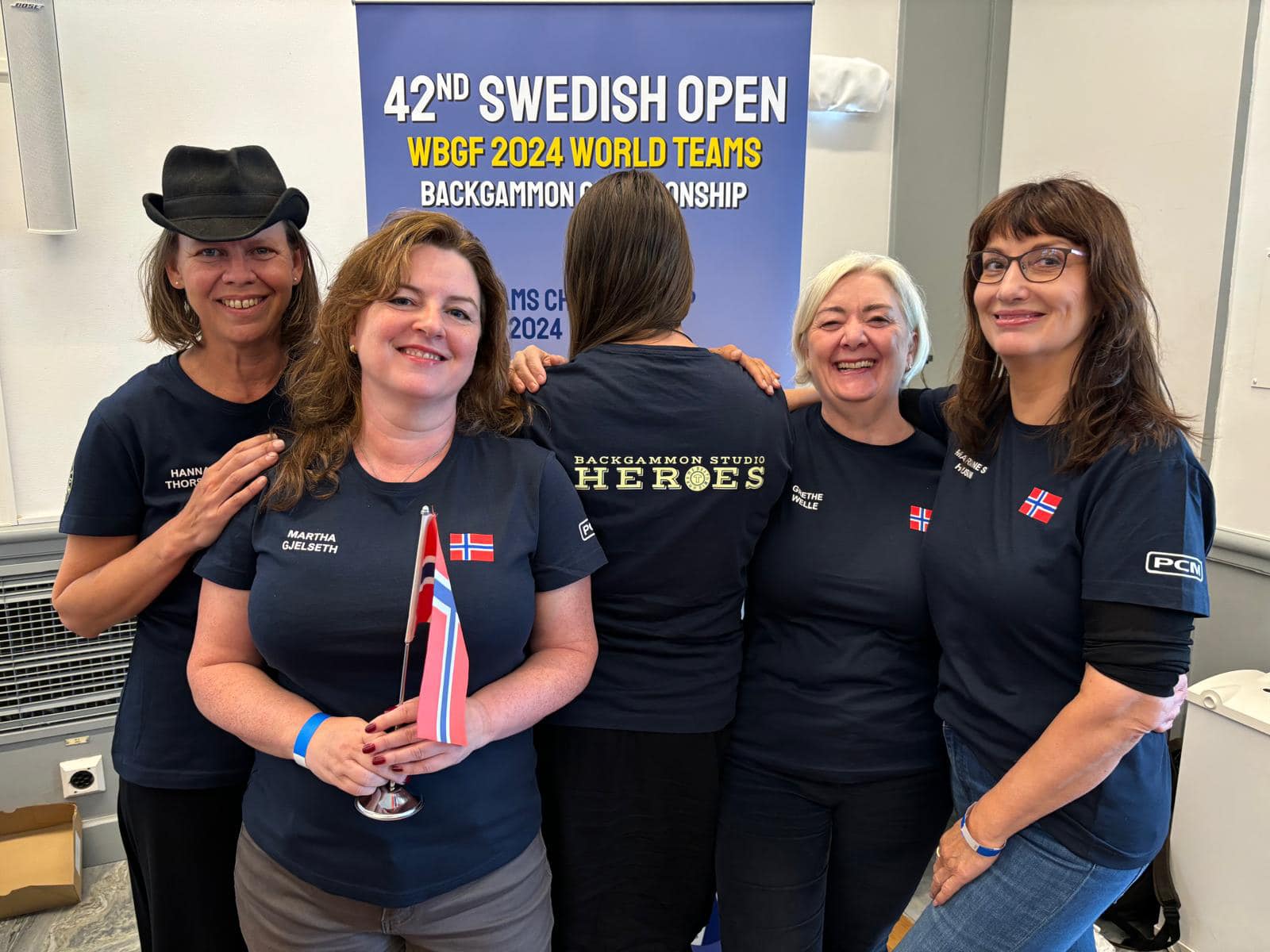 Norge spiller i lag-VM i Stockholm - nye landslagstrøyer takket være gode sponsorer i Backgammonstudio Heroes (v/Terje Pedersen) og PCM Security (v/Per Magne Tronvoll). Nytt av året er egen dameklasse! Norge har sju spillere i troppen (Snarheim, Kritikos, Røyset, Svendsen, Liby, Eikseth og Arntzen), dametroppen talte fem (Gjelseth, Thorsen, Husum, Osbakk og Kvan Welle), med fem respektive tre bord i hver landskamp.