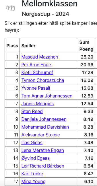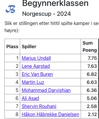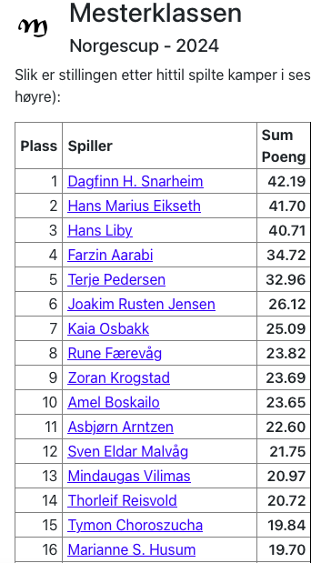 De 16/16/8 beste fra 3 poengtabeller er klare. Les mer i nyheten om format og gjennomføringen av Begynnermøtet (online) 11. januar, Mellommøtet (online) 18. januar og Mestermøtet LIVE i Oslo 25.-26. januar Vi gratulerer alle 16-16-8 deltagere i sluttspillet og velkommen til nye sjangser i 2025!
