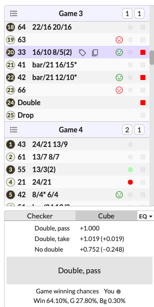 Vi kan også se i bildene at svart skulle også ha doblet i sitt neste kast (nr. 22), men doblet først i kast 24. Men da sier analysen at det var feil å doble! Hvordan kan det ha seg? Jo, i kast 24 var nok svart blitt så stor favoritt at hen skulle spilt for gammon, og det har sannsynligvis vært en enkel avgjørelse for hvit å droppe. Dette illustrerer at det er viktig å doble i tide: hvis svart hadde doblet i kast 20 og hvit hadde tatt, så ville svart med god sannsynlighet vunnet gammon og 4 poeng. Nå doblet svart for sent og må nøye seg med bare 1 poeng.