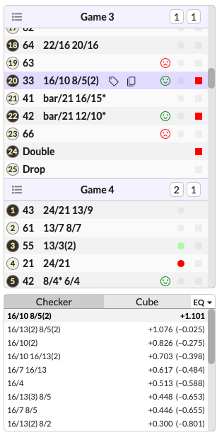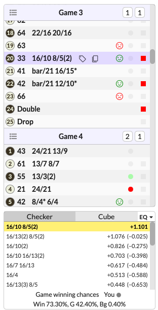 Hvor stor var gammon-sjansen til svart etter kast nummer 20? Det kan vi se i de to bildene til høyre. Svart gjorde ingen feil i brikkeflyttet (som indikeres med at sirkelen til høyre er grå), og flyttet 16/10 8/5(2) som er beste flyttet. Hvis man klikker på selve flyttet ser man vinnersannsynlighetene nederst i det tredje bildet: Sannsynligheten for å vinne er 73.3%, og av disse seirene vil 42.4% være gammon.