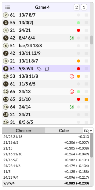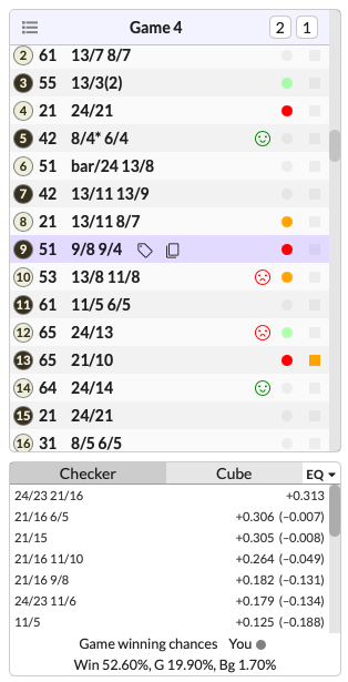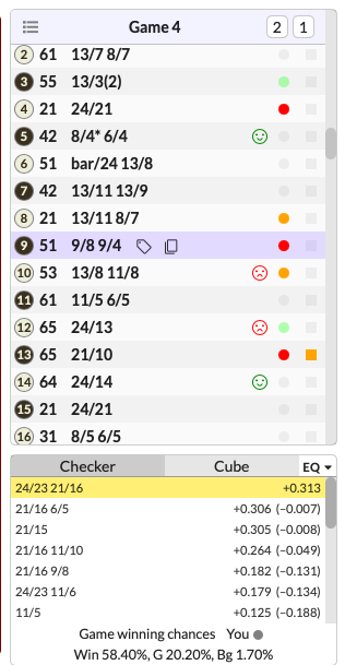 Så skal vi ta for oss en blunder i selve brikkeflyttet og hva man burde flyttet. I det første bildet ser vi at svart kastet 51 i kast nummer 9, og flyttet to brikker fra 9-punktet med 9/8 9/4. Nederst i bildet ser vi at flyttet 9/8 9/4 kommer ganske langt ned på listen over mulige flytt for svart. Listen er sortert etter equity, og tallet +0.083 indikerer at svart kan forvente å vinne 0.083 poeng i gjennomsnitt etter dette flyttet. Vi ser også at hvis svart hadde flyttet 24/23 21/16, som ligger øverst på listen, ville svart hatt en equity 0.313 poeng. Det gir en differanse på 0.230 poeng mellom beste flytt og det som svart faktisk flyttet, og denne differansen står i parentes utenfor svarts faktiske flytt. Feilen svart gjorde her kostet hen altså 0.23 poeng i equity.