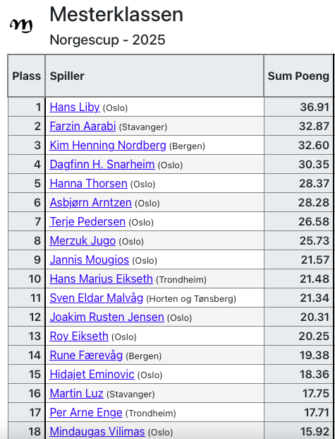 De 16 beste fra 3 poengtabeller er klare. Les mer i nyheten om format og gjennomføringen av 3 klasser Finalespill Norgescup 2025 blir! Vi gratulerer alle 16 x 3 deltagere i sluttspillet og velkommen til nye sjangser i 2026!